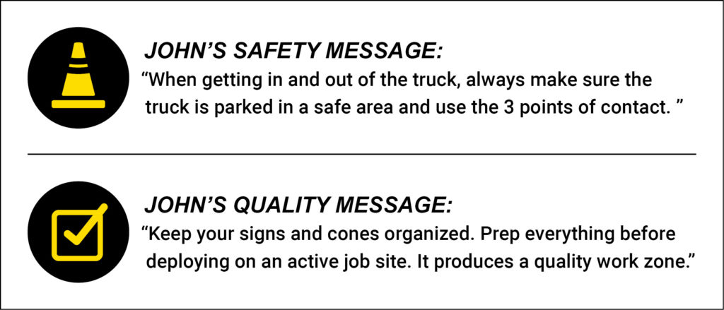 John: The first day! I went out with Gary Clarke on a job and set up the signs. No client showed up and the job was canceled. Another memory was this job with Brian Wieport. The flagging operation had us sending cars around a bend. I was nervous cars were going to be sent around the bend when they shouldn’t have been, leading to a collision. It was a long nine-hour day, but everything turned out well.