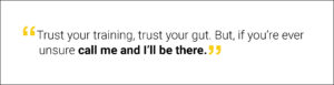 His leadership is hands-on and rooted in encouragement. He assures peers to have confidence and to not second-guess themselves. “Trust your training, trust your gut. But, if you’re ever unsure, call me and I’ll be there.”